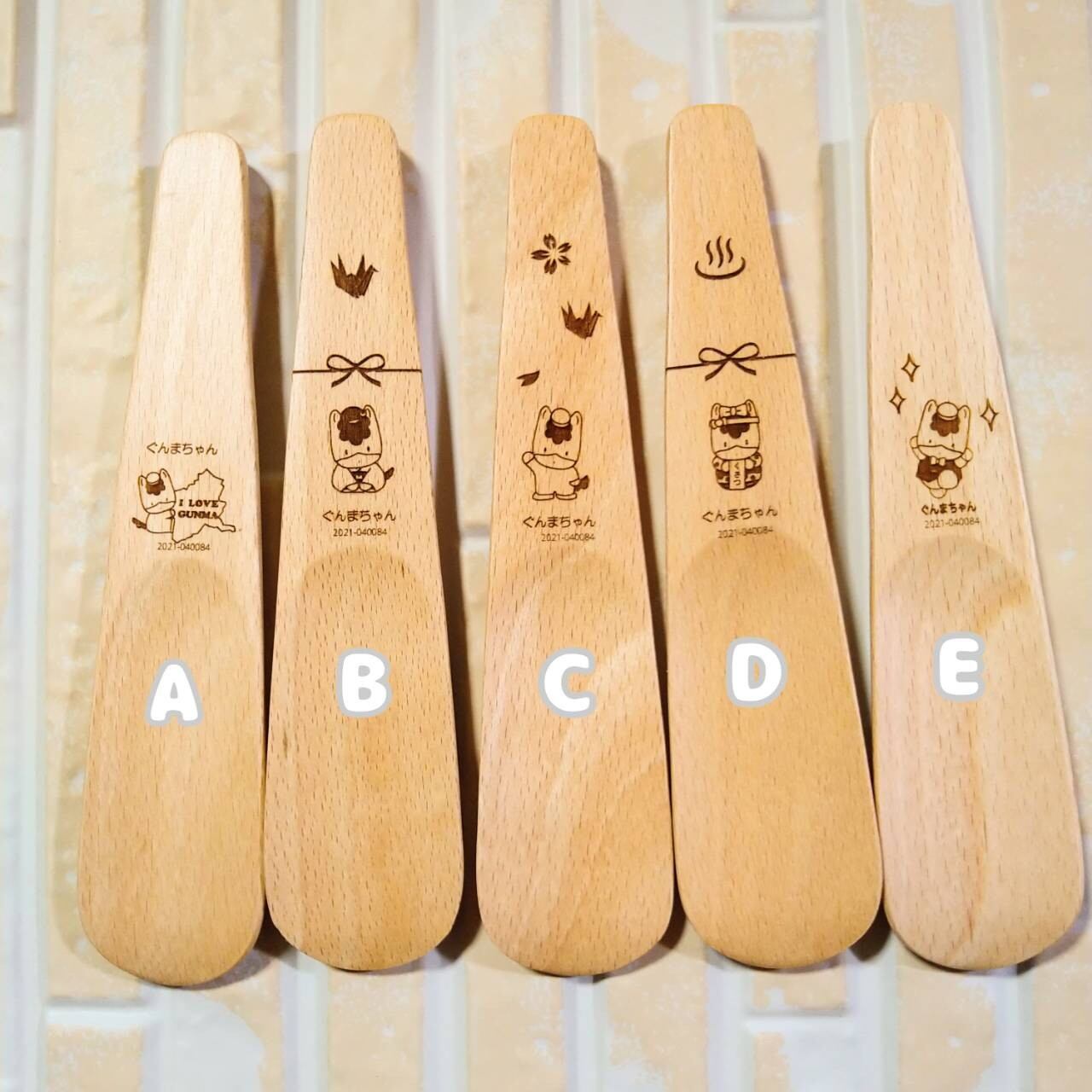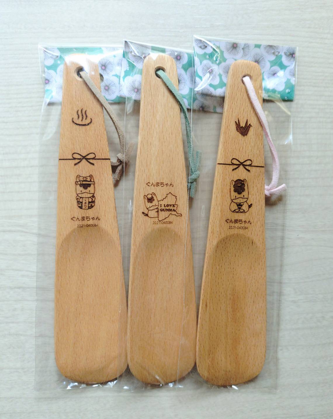 あたたかみを感じられる木製靴べらに、ぐんまちゃんのデザインをレーザーで彫刻しています。