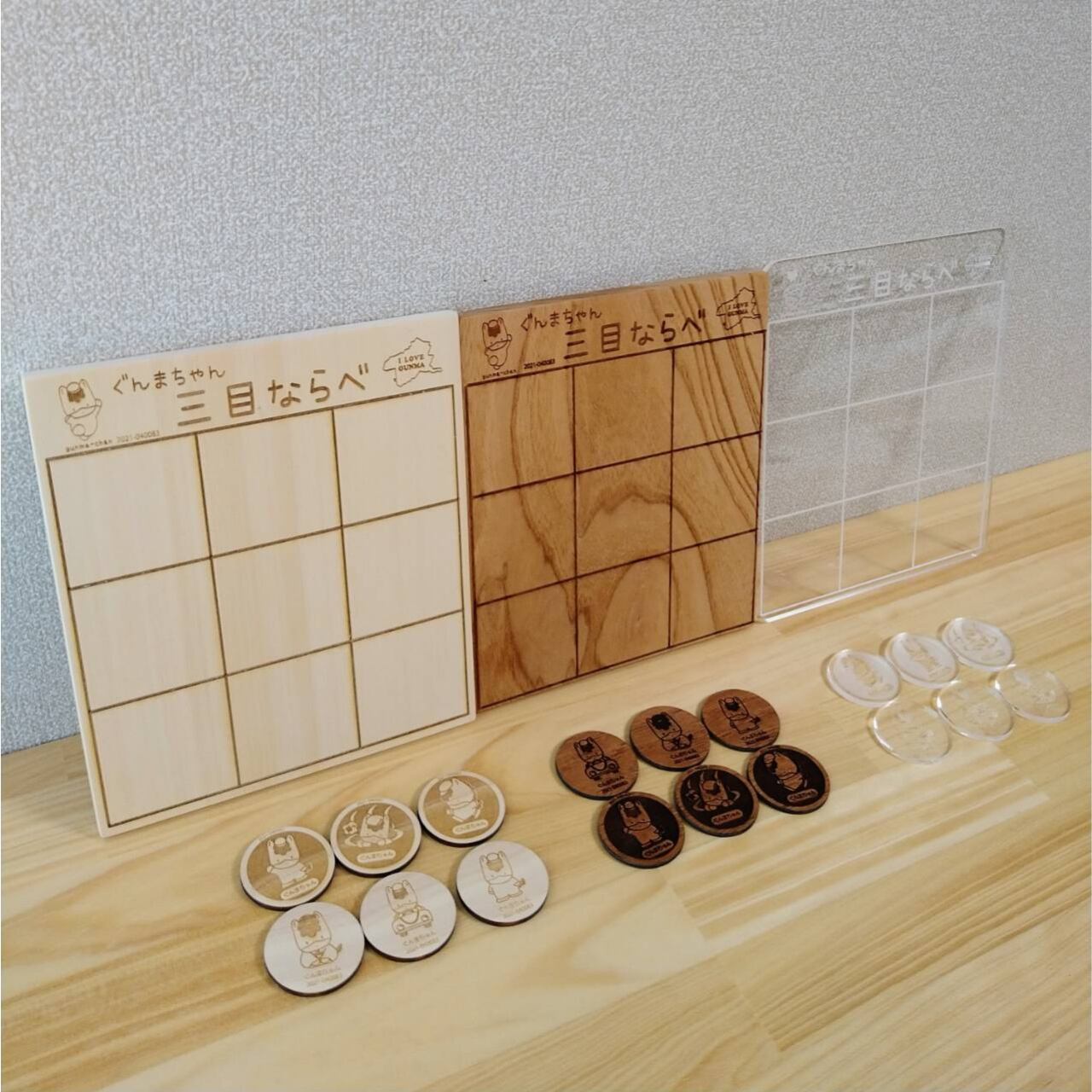 群馬県の木が、沢山の工程を得て、三目の盤になり、ぐんまちゃんのイラストコマになって、遊んでくださる方々のお手元へと届きます。