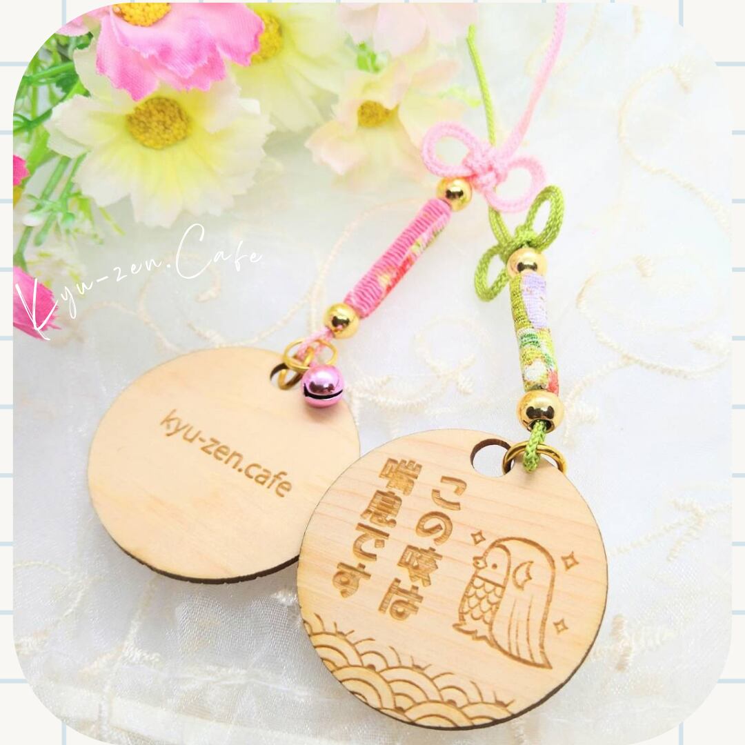 木曽ヒノキ香る、アマビエ様メッセージキーホルダー【喘息】(二重叶結びタイプ)です。